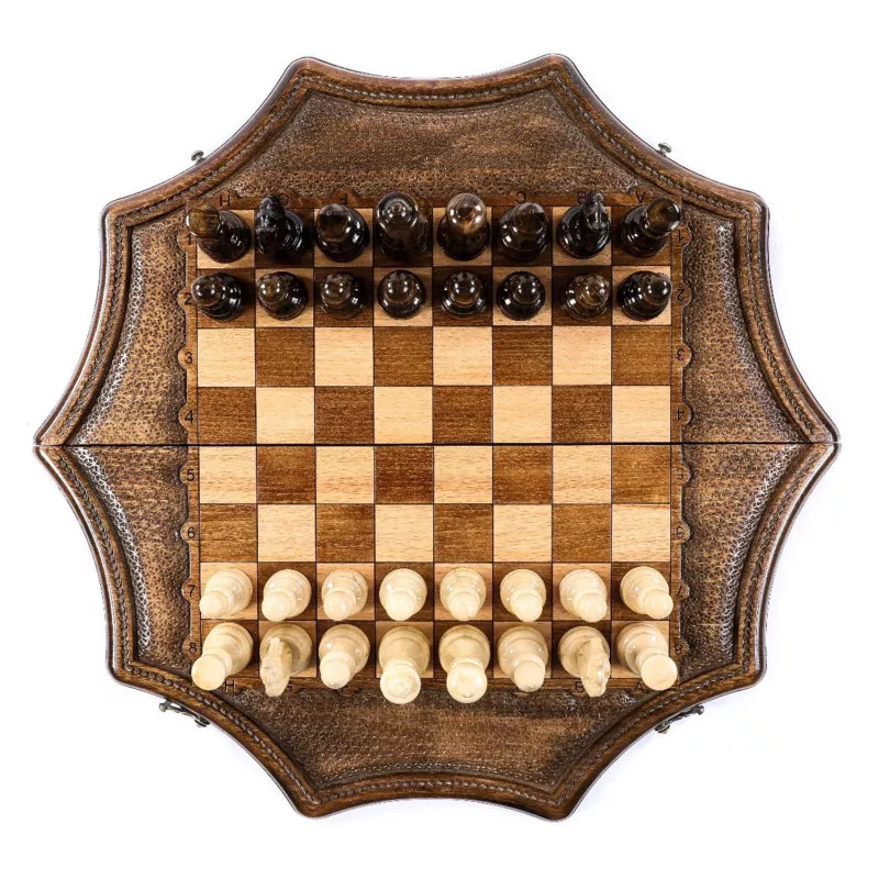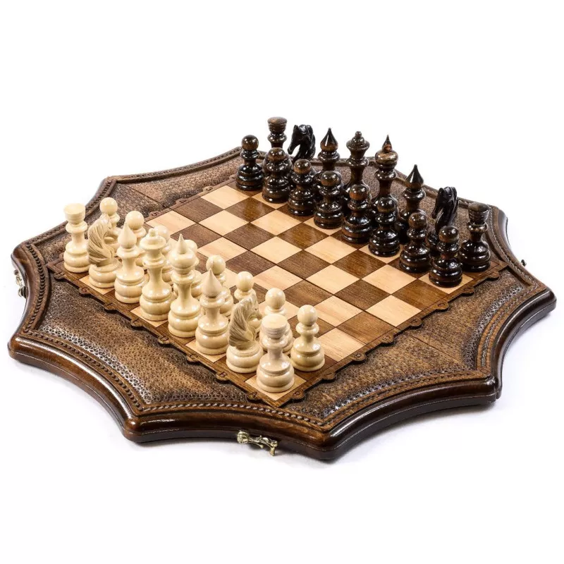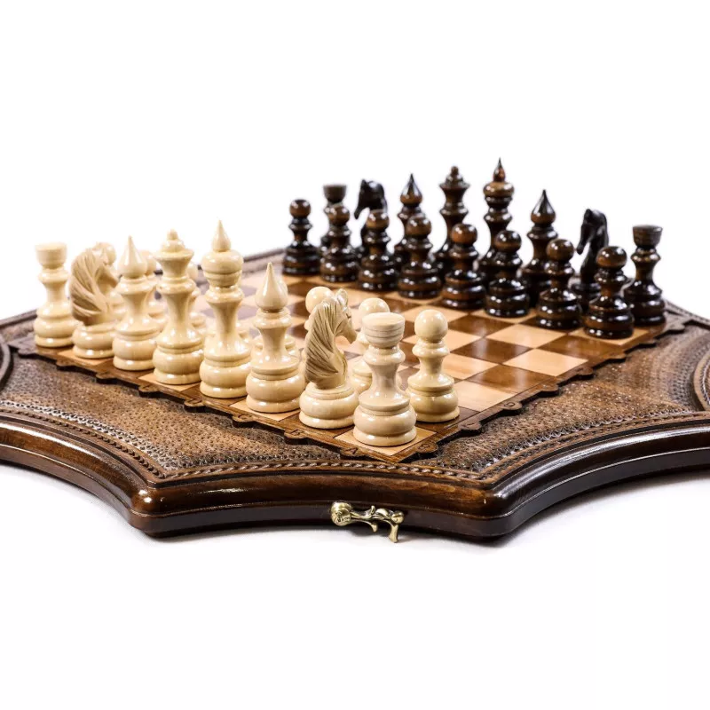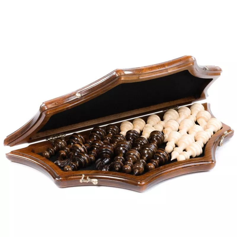 Այս աստղաձև մոդելի շախմատը պատրաստված է հաճարենու մեկ զանգված փայտից: Ամբողջությամբ ձեռագործ աշխատանք է: Լաքապատ է, թվերը և տառերը փորագրված են, ծխնիներն ու փականները ձուլված են բրոնզից: Ներառում է ֆիրմային պայուսակ Մանրամասներ Փայտը՝ հաճարենի և ընկուզենի Հեղինակ և Արտադրող Արտադրված է Հայաստանում Արտադրող՝ Հրաչյա Օհանյան