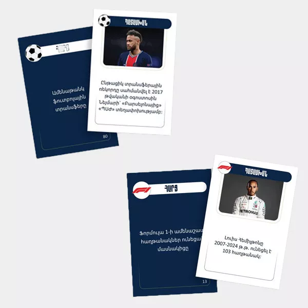 Խաղաքարտերի մի կողմում կգտնեք հարցեր սպորտի ամենից ամենաների մասին, իսկ մյուս կողմում այդ հարցերի պատասխանները։