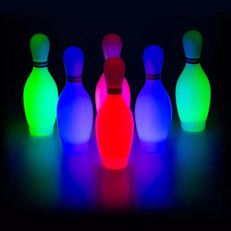 Բոուլինգի հավաքածու՝ նախատեսված 3+ տարիքի երեխաների համար։ Կեգլիները լուսավորվում են տարբեր գույների լույսերով, ինչի շնորհիվ մթության մեջ խաղն առավել տպավորիչ է դառնում։ Խաղի ընթացքում երեխան կմարզվի արագությունը, տեսողությունը, շարժումները համակարգելու կարողությունը։Ներառում է 6 կեգլի 1 գնդակ Մանրամասներ Տարիքը՝ 3+ Գնդակի տրամագիծը՝ 9 սմ Կեգլիի բարձրությունը՝ 18 սմ Տուփի չափսերը՝ 30x20x15 սմ
