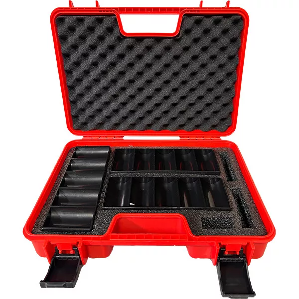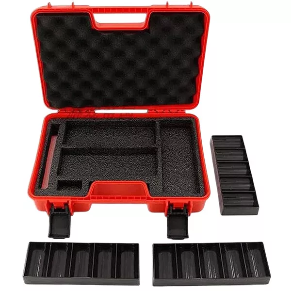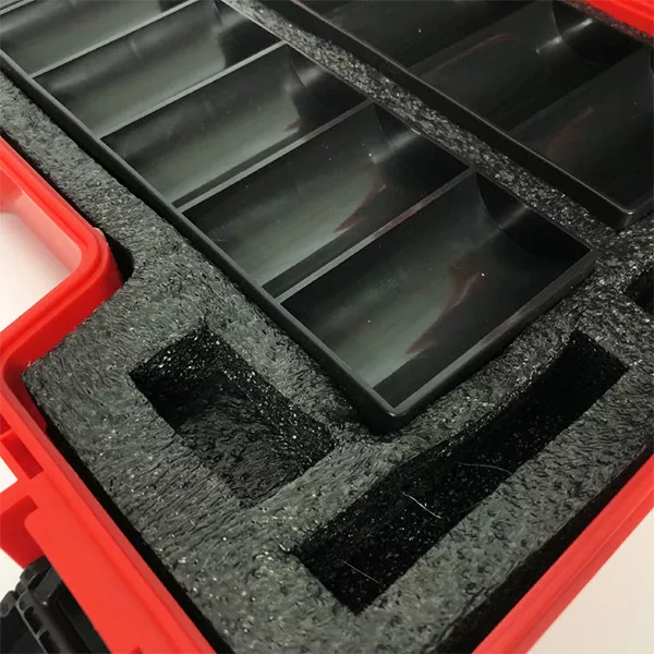 Պոկերի չիպերի համար նախատեսված յուրօրինակ տեսքով պլաստմասե ամուր պայուսակ։ Թեթև, շարժական և ամուր։ կարմիր պայուսակն ունի սպունգով ծածկված կափարիչ՝ հարվածներից պաշտպանվելու համար: