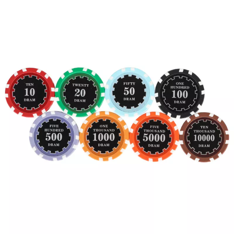 Պրոֆեսիոնալ չիպեր «ԴՐԱՄ»11.5 գրամ քաշով (ներսում մետաղական միջուկով), պատրաստված ամուր և դիմացկուն նյութից։Հավաքածուն ներառում է հետևյալ չիպերի արժեքները `10, 20, 50, 100, 500, 1000, 5000, 10000։Մանրամասներ Քաշը` 11.5 գրամ Նյութը՝ ABS պլաստիկ և մետաղ