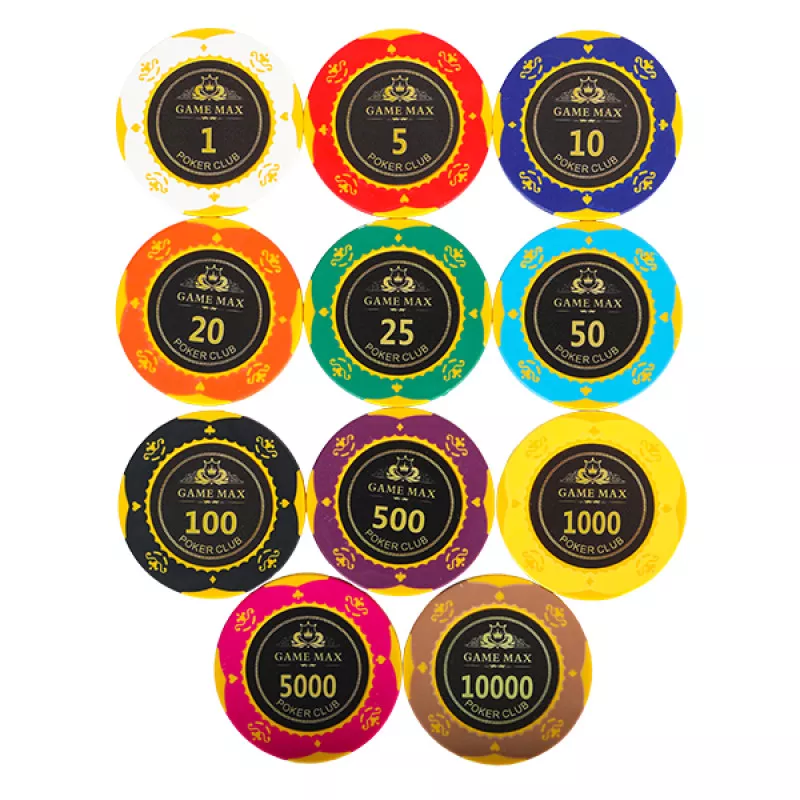 Պրոֆեսիոնալ չիպեր «Գեյմ Մաքս», 14 գրամ քաշով (ներսում մետաղական միջուկով)՝ պատրաստված ամուր և դիմացկուն նյութից։Առկա է հետևյալ արժեքային չիպերը `1, 5, 10, 20, 25, 50, 100, 500, 1000, 5000, 10000։