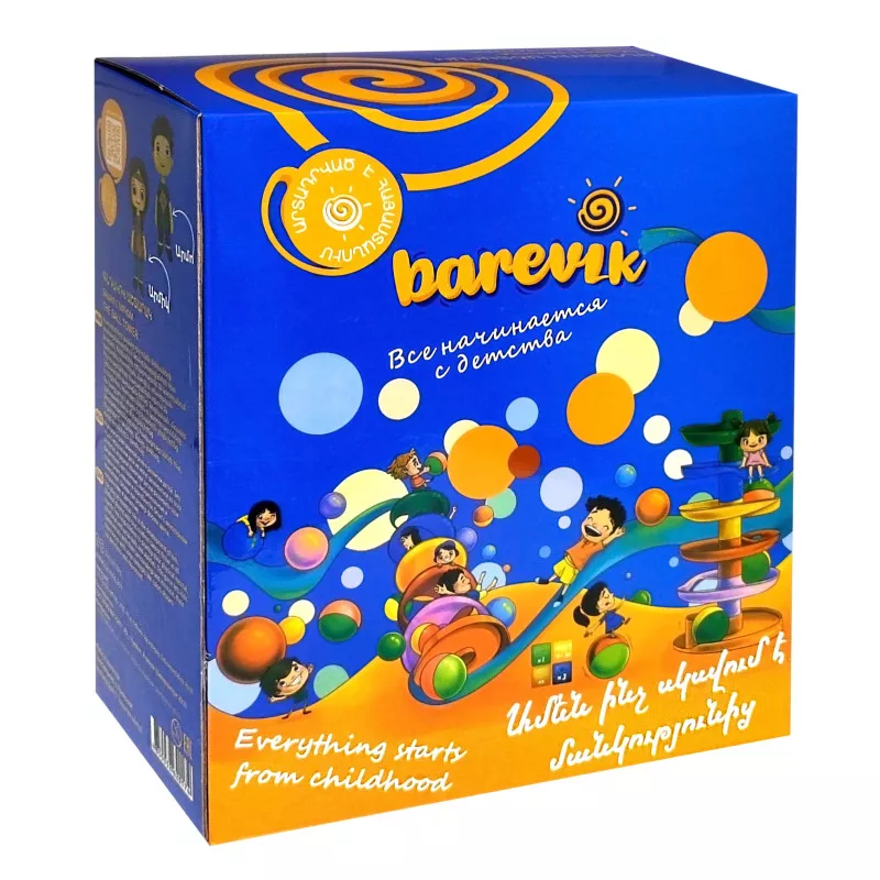 Գնդերով աշտարակ տուփով Ներառում է 2 գնդակ: Խաղը գերազանց զարգացնում է ձեռքերի շարժունակությունը: Նախատեսված է 9 ամսեկանից սկսած երեխաների համար: