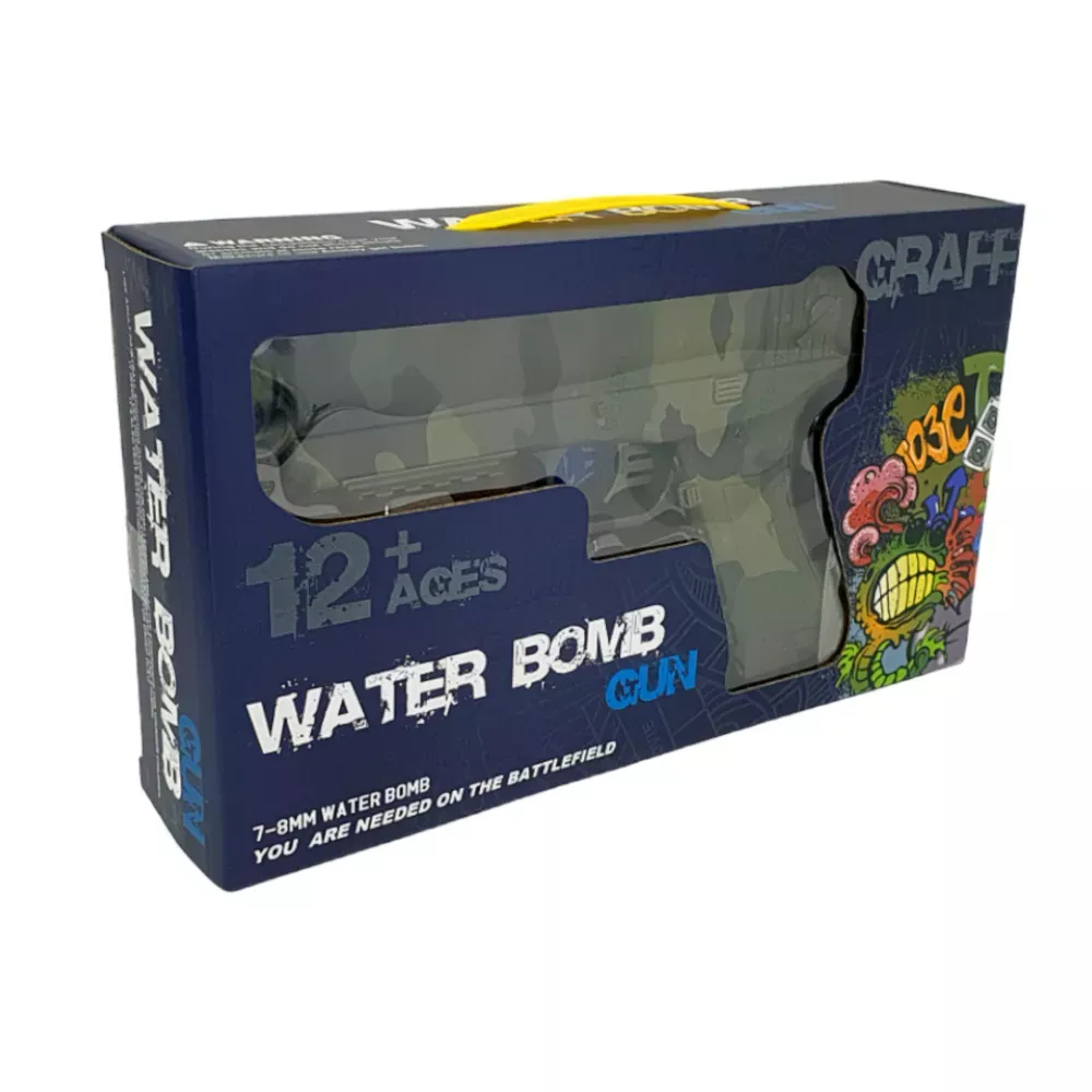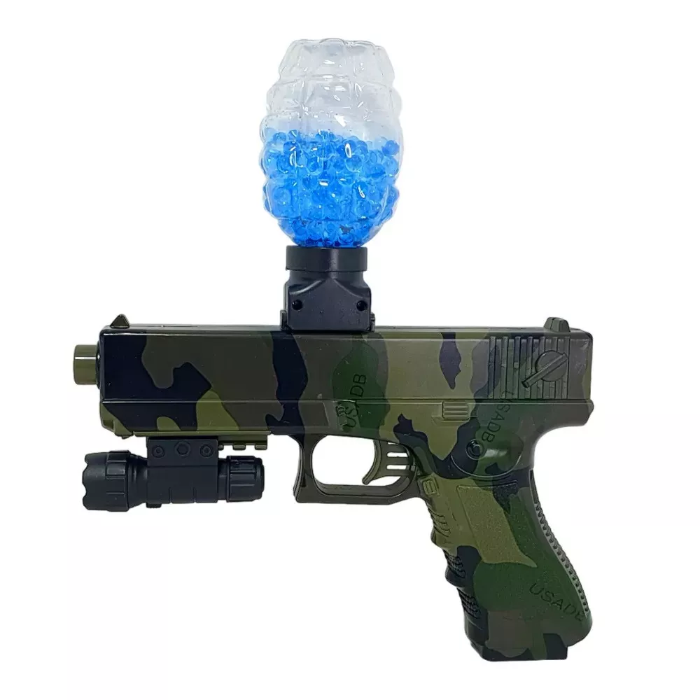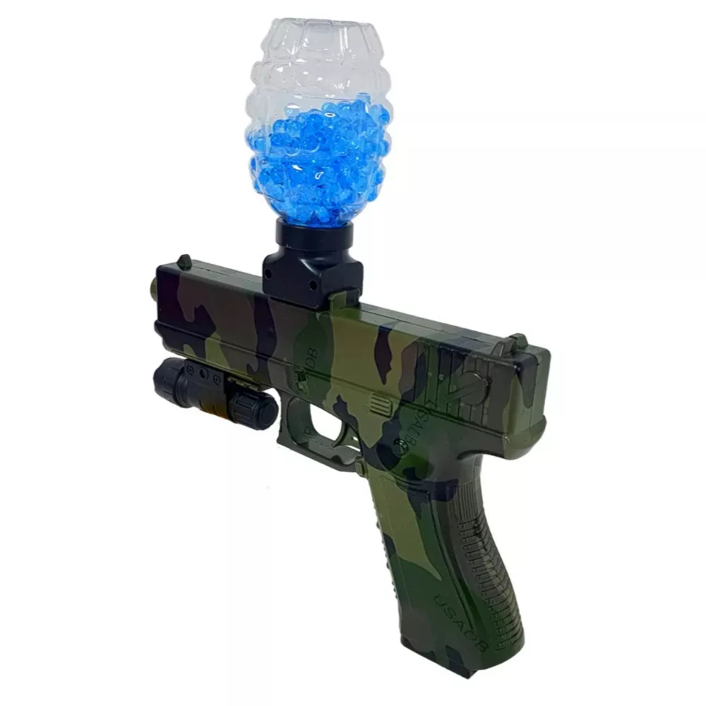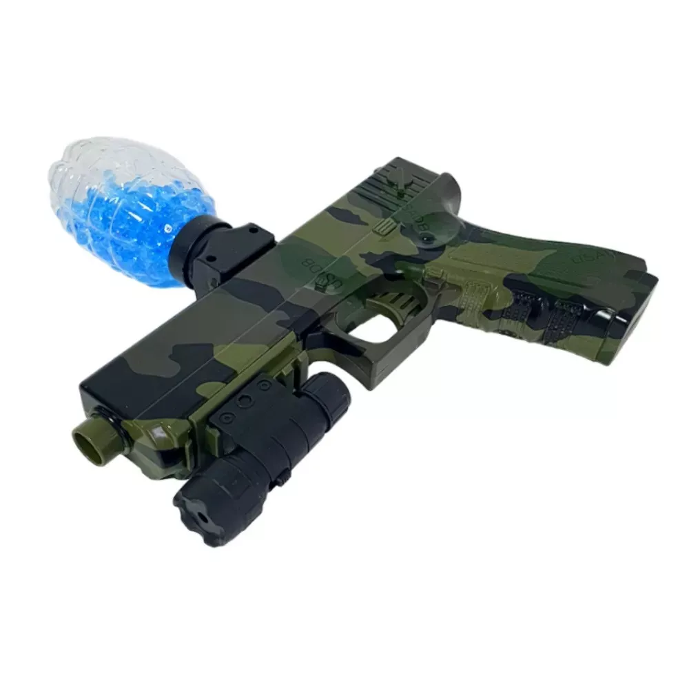Հիդրոգելային ատրճանակ` լազերային նշանառույով, մարտկոցով, լիցքավորիչով և անվտանգության ակնոցներով: Ատրճանակն արձակում է հիդրոգելի փափուկ փամփուշտներ և ապահովում երեխաների անվտանգ խաղը: Խաղացեք հիդրոբոլ հենց ձեր բնակարանում, իսկ բակում կարող եք իրական էպիկական մարտեր բեմադրել։ Գնդակի թռիչքի առավելագույն հեռավորությունը հասնում է մինչև 10 մետրի: