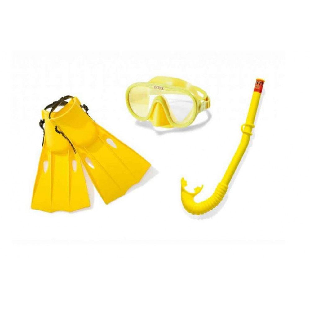 Комплект для плавания INTEX серии "Master Class Swim Set" состоит из маски, трубки и ласты желтого цвета.
