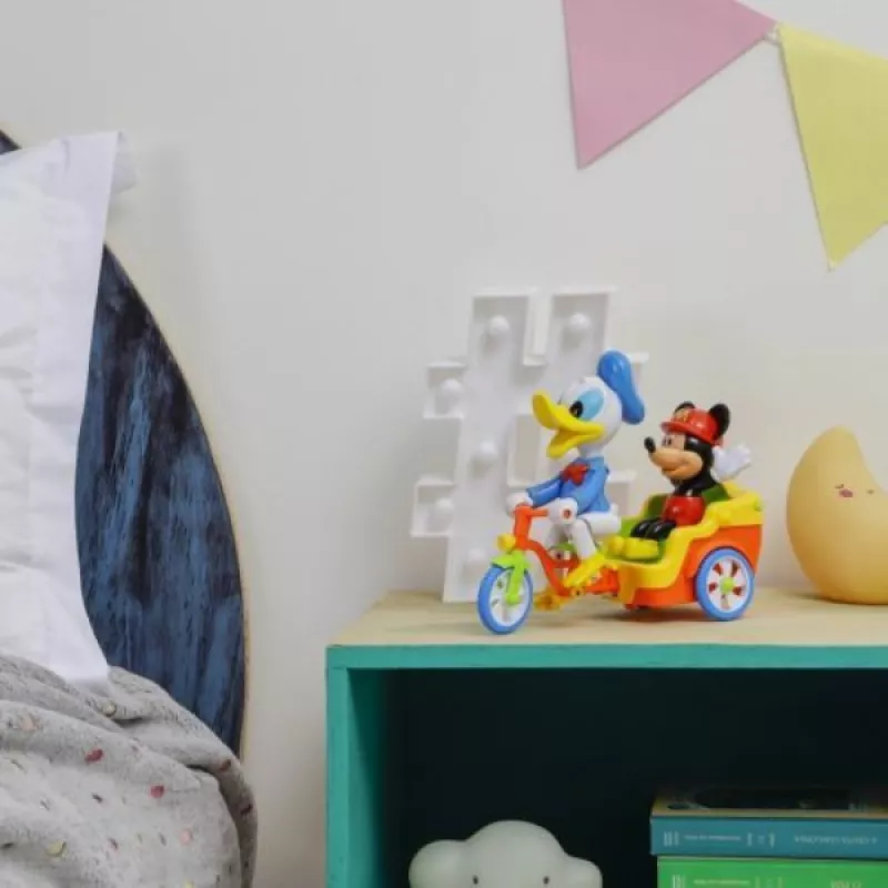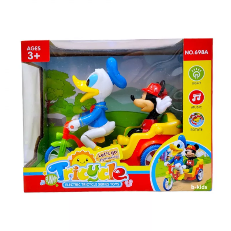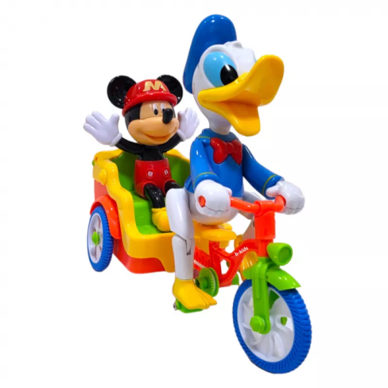 Դոնալդ Դաքը և Միկի Մաուս եռանիվ հեծանիվ։ Եռանիվ խաղալիքը գրավիչ դիզայնով զվարճալի խաղալիք է, որը զվարճացնում է փոքրիկին: Երեխաներին դուր կգա դիտել, թե ինչպես է այս խաղալիքը շարժվում և երգում: Առջևի բռնակը ունի մեղեդի երեխաների ժամանցի համար։ Հետևի զամբյուղը կարող է տեղափոխել փոքրիկ խաղալիքներ։ Այն շարժվում է բոլոր ուղղություններով և երբ հանդիպում է խոչընդոտի, փոխում է ուղղությունը։ Գործողությունը կատարվում է միացման/անջատման կոճակի միջոցով: Մանրամասներ Աշխատում է 3 AA մարտկոցով (ներառված չէ): Խաղալիքի չափսը՝ 22 սմ։ Լուսային և ձայնային
