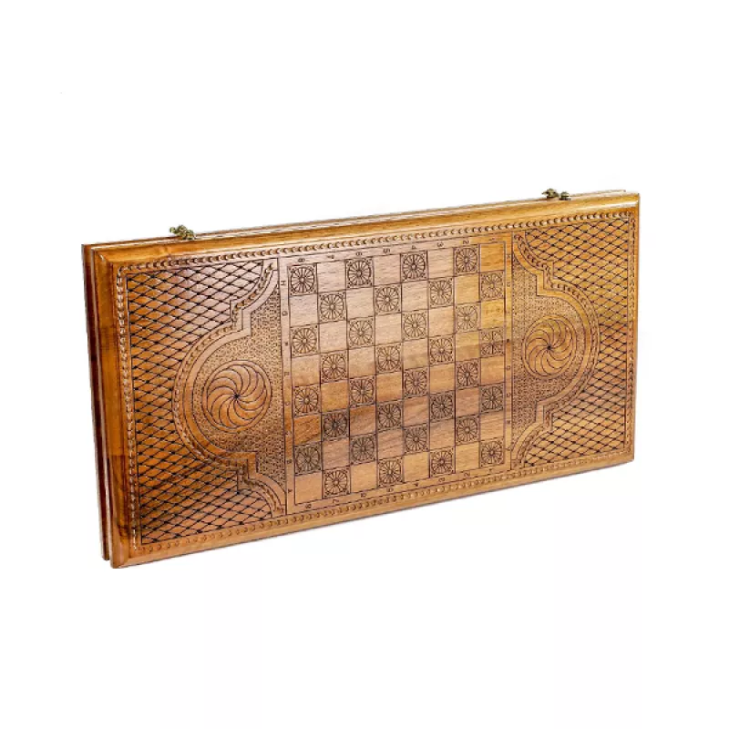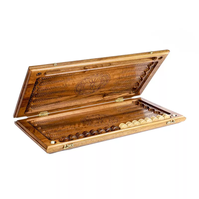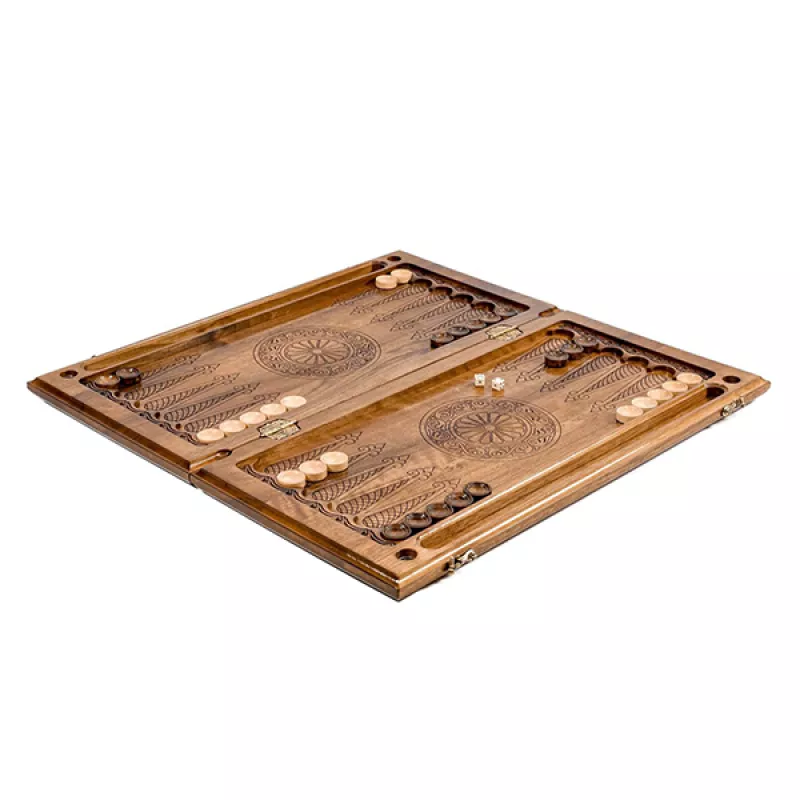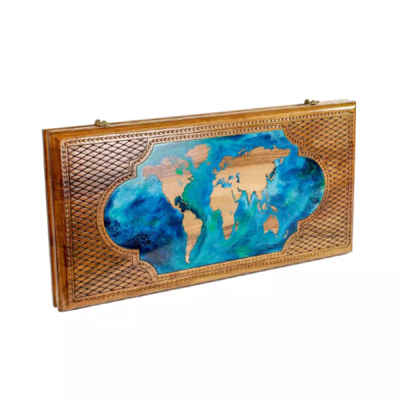 Այս դասական մոդելի նարդին, պատրաստված է ընկուզենու մեկ զանգված փայտից, որի վրա փորագրված է աշխարհի քարտեզը` գունազարդված էպոքսիդային խեժով:Ամբողջությամբ ձեռագործ աշխատանք է: Լաքապատ է, ծխնիներն ու փականները ձուլված են բրոնզից: Նարդու մյուս կողմում շաշկու համար նախատեսված դաշտ է: Ներառում է 32 խաղաքար Զառեր ֆիրմային պայուսակ Մանրամասներ Բրենդ: Հրաչյա Օհանյան Չափսերը՝ 60x60x3 սմ Փայտի տեսակ: Ընկուզենի