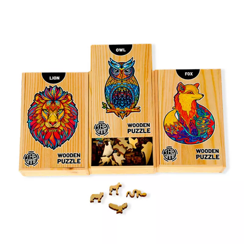 Փայտե փազլներ Tab Game` կենդանիների կերպարներով։ Բոլոր տարրերի մեջ դուք անպայման կճանաչեք կենդանիների բազմաթիվ ձևեր: Թույլ տվեք ձեզ զարմացնել փայտե դետալներով և յուրօրինակ ձևով: Բոլոր կտորները եզակի են, դուք չեք գտնի երկու նույն տարրերը: Նրանց հետ խաղալը պահանջում է նվիրվածություն և համբերություն, բայց մյուս կողմից՝ դա ձեզ մեծ հաճույք և բավարարվածություն կպարգևի: Մանրամասներ Մասերի քանակը - 100 -150 Պատկերի չափը - A4 Տուփի չափսերը՝ 15x10x4 սմ