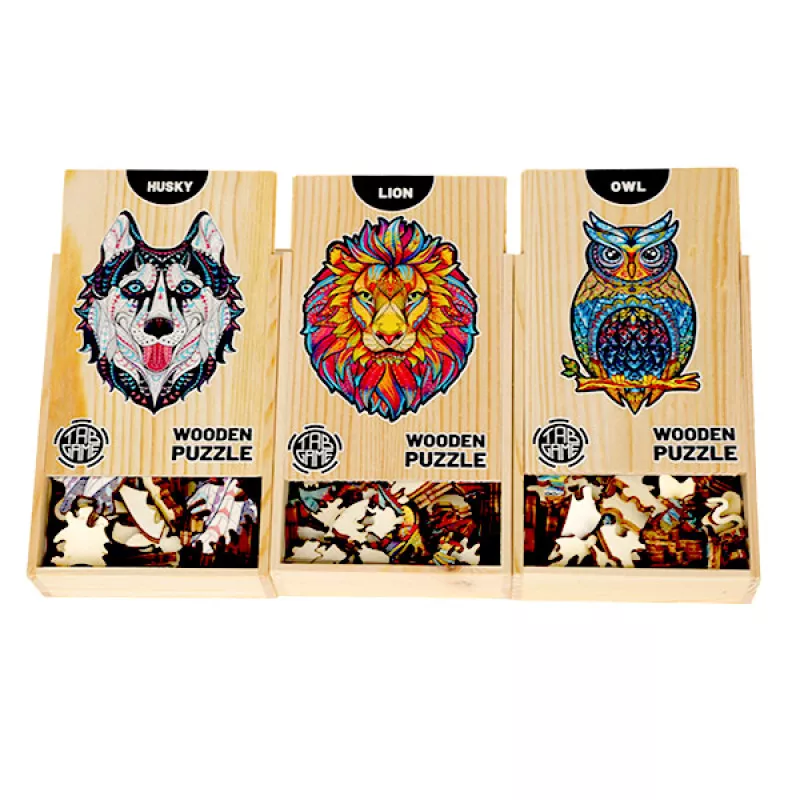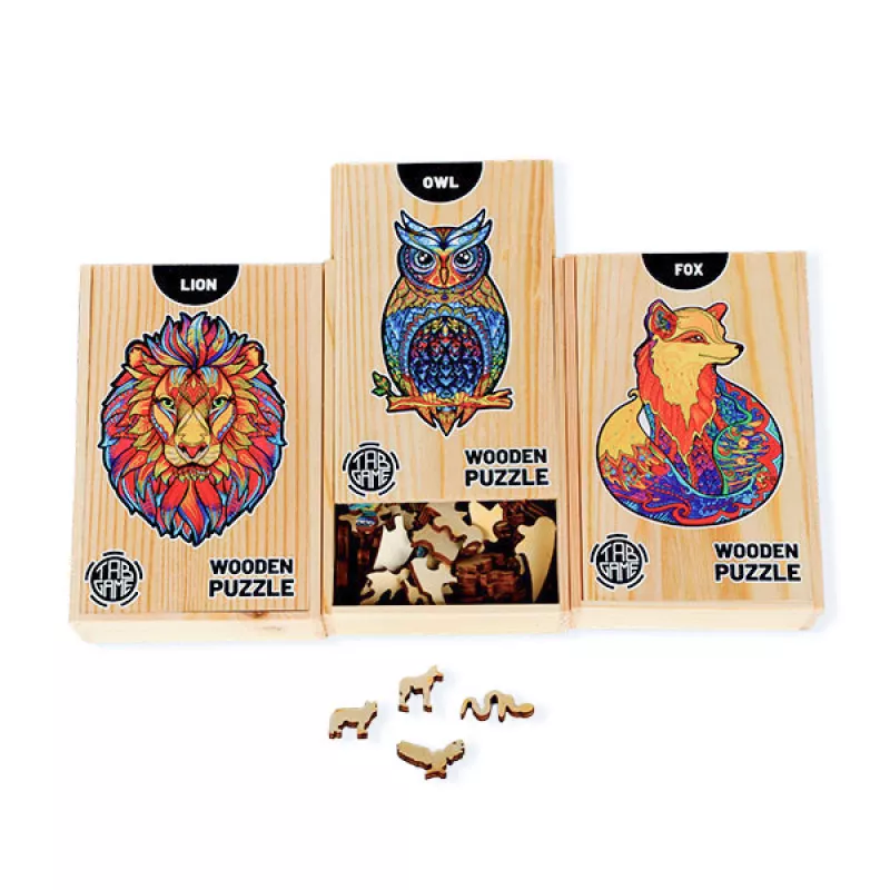 Փայտե փազլներ Tab Game` կենդանիների կերպարներով։ Բոլոր տարրերի մեջ դուք անպայման կճանաչեք կենդանիների բազմաթիվ ձևեր: Թույլ տվեք ձեզ զարմացնել փայտե դետալներով և յուրօրինակ ձևով: Բոլոր կտորները եզակի են, դուք չեք գտնի երկու նույն տարրերը: Նրանց հետ խաղալը պահանջում է նվիրվածություն և համբերություն, բայց մյուս կողմից՝ դա ձեզ մեծ հաճույք և բավարարվածություն կպարգևի: Մանրամասներ Մասերի քանակը - 100-150 Պատկերի չափը - A4 Տուփի չափսերը՝ 15x10x4 սմ