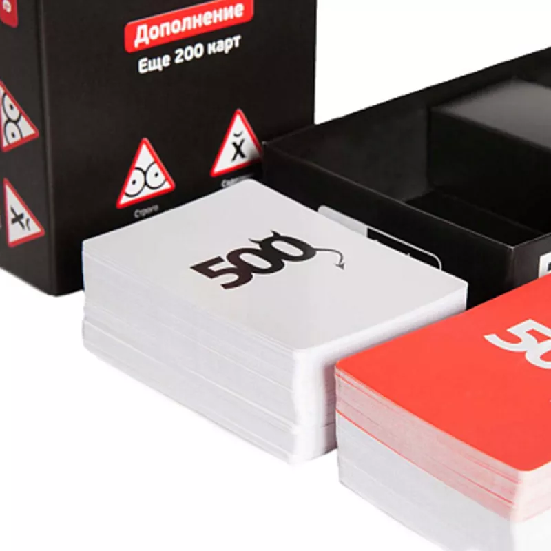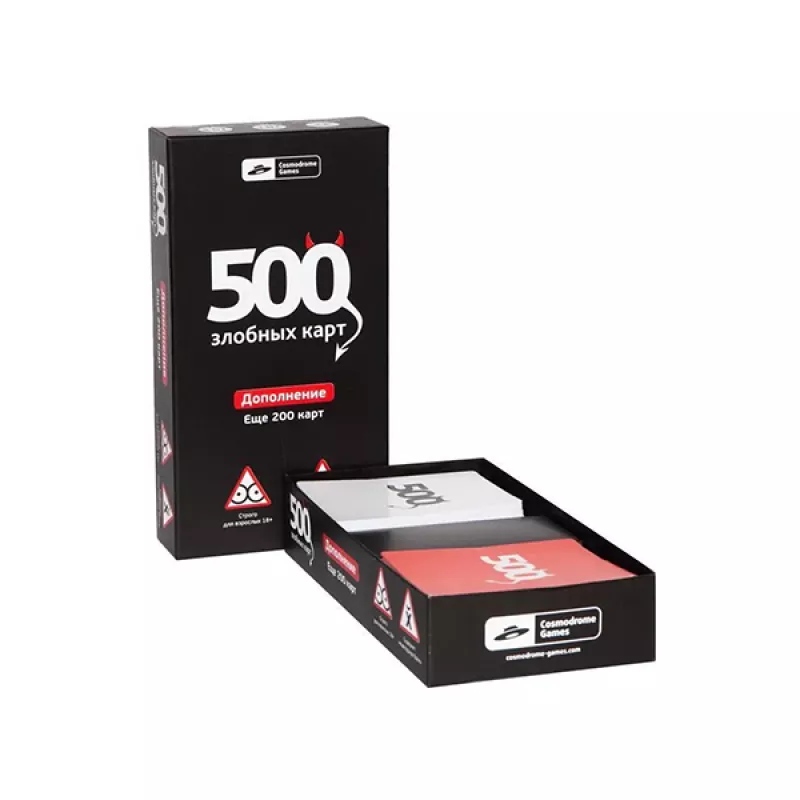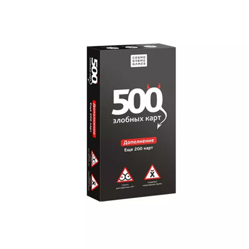 Սա «500 չար խաղաքարտ»-ի հավելումն է, որը հնարավոր չէ խաղալ առանց հիմնական տարբերակի խաղադաշտի չիպերի և կանոնների։ Այստեղ կան միայն նոր քարտեր՝ հարցերով ու պատասխաններով:Ներառում է Մանրամասներ և փաստեր 40 հարց 160 պատասխան Մանրամասներ Տարիքը՝ 18+ Խաղացողների թիվը՝ 3–100 Խաղի տևողությունը՝ 15 րոպե Տուփի չափսերը՝ 13.2x9.5x9.7 սմ Հեղինակ և Արտադրող Թողարկման տարեթիվ՝ 2017 թ Արտադրող՝ Cosmodrome