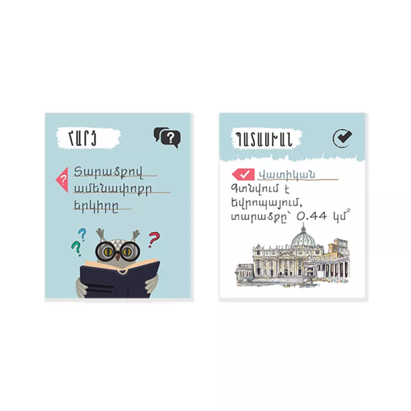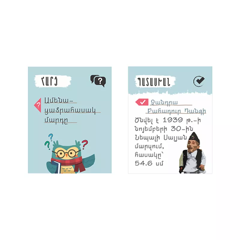 Խաղը կարելի է խաղալ և մրցելու ևինքնակրթվելու նպատակով, տուփում առկա են 210 խաղաքարտեր, որոնց մի կողմ կգտնեք հարցեր աշխարհի ամենից ամենաների մասին, իսկ մյուս կողմում՝ հարցերի պատասխանները։