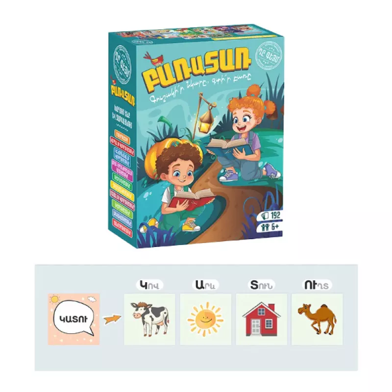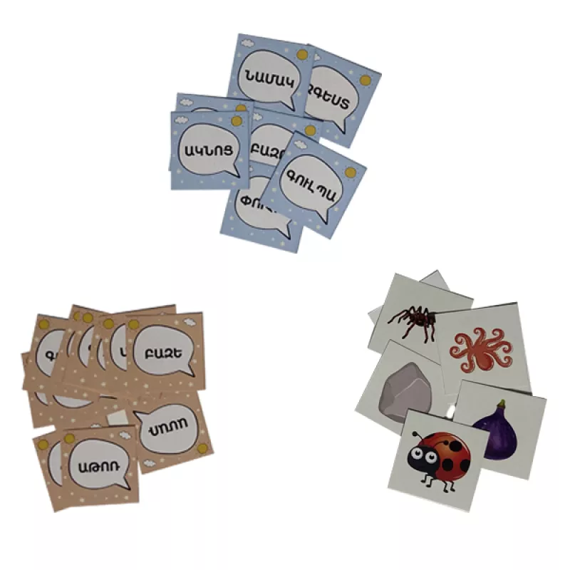 Բառերով խաղաքարտերը շրջված դրվում են սեղանին: Մասնակիցներից մեկը վերցնում է վրայի խաղաքարտը, մտքում կարդում բառը, այնուհետև նկարներով խաղաքարտերի միջից գտնում և հերթականությամբ սեղանին է դնում այդ բառի բոլոր տառերով սկսվող նկարներ: