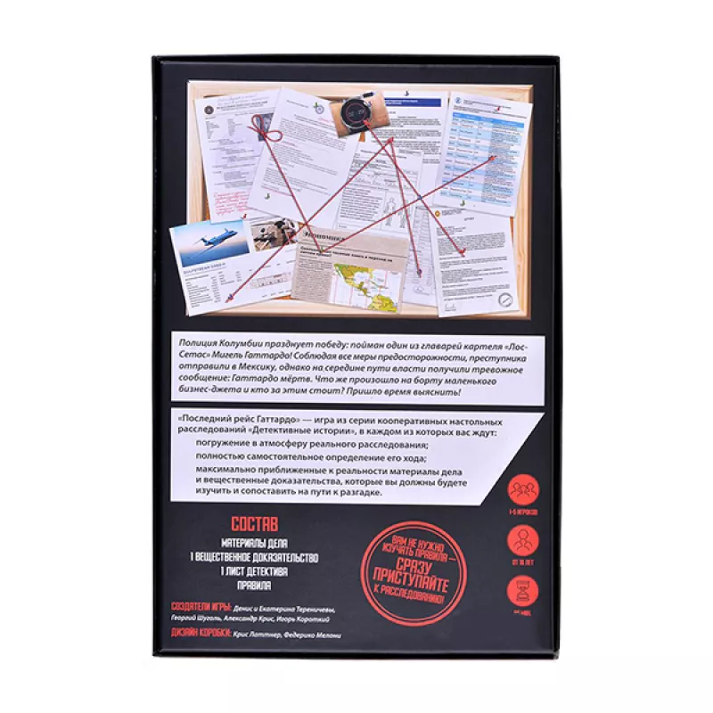 «Լոս Սետաս» կարտելն իր ազդեցությամբ ծածկել է Մեքսիկայի մեծ մասը։ Նրա դաժան զինյալները, որոնք լքել են բանակի էլիտար ստորաբաժանումները, սարսափեցնում են և՛ խաղաղ բնակիչներին, և՛ ոստիկաններին՝ մեկը մյուսի հետևից արյունալի ջարդեր իրականացնելով։ Նրանց խղճի վրա մեկից ավելի զանգվածային գերեզմաններ կան, և օրենքի ծառայողները, ովքեր ընդդիմանում են նրանց, հաճախ: Այնուամենայնիվ, վերջերս Կոլումբիայի ոստիկանությունը գործողություն իրականացրեց և բռնեց ամենադաժան զինյալ առաջնորդներից մեկին` Միգել Գատարդոյին: Կարելի է պատկերացնել, թե որքան մութ գաղտնիքներ ու անուններ կարող էր նա հայտնել։ Սակայն այս ամենը միայն դատարկ հույսեր, քանի որ Միգելը մահացավ բիզնես-ջեթում, որը նրան գաղտնի տեղափոխում էր Մեքսիկա։Ներառում է գործի նյութեր իրեղեն ապացույցներ Դետեկտիվի թերթիկ Խաղի կանոններ Մանրամասներ Տարիքը՝ 18+ Խաղացողների թիվը՝ 1-5 Խաղի տևողությունը՝ 60 րոպե Լեզու՝ Ռուսերեն Տուփի չափսերը՝ 235x157x47 մմ Քաշը՝ 0,16 կգ Հեղինակներ և Արտադրող Թողարկման տարեթիվ: 2022 թ Արտադրող: Hobby World