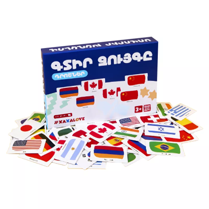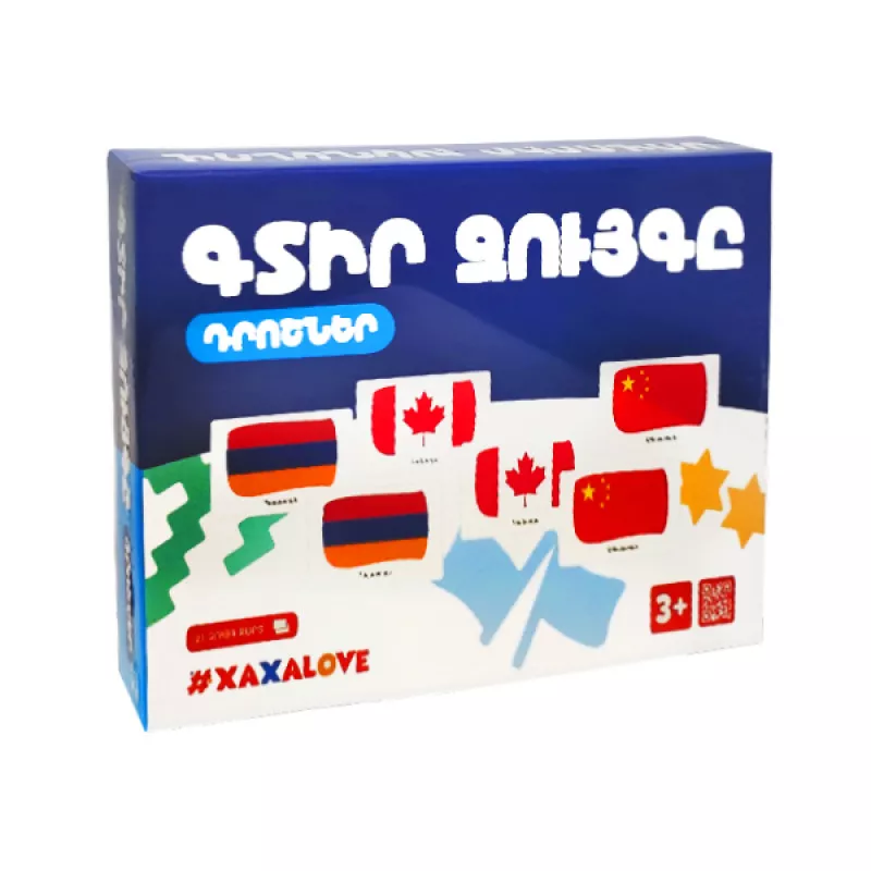Խաղի միջոցով երեխան սովորում է դրոշները։Այն մարզում է երեխայի հիշողությունն ու ուշադրությունը։ Մանրամասներ Ներառում է 42 խաղաքարտ Տարիքը՝ 3+ Լեզուն՝ Հայերեն Տուփի չափսերը՝ 27x15x3.5 սմ Արտադրված է Հայաաստանում Արտադրող՝ Xaxalove
