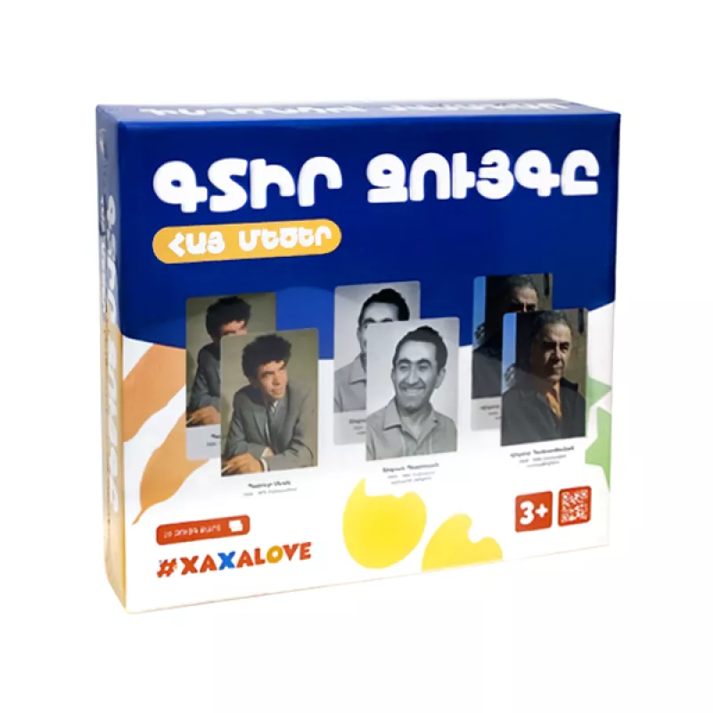 Խաղի միջոցով երեխան կճանաչի հայ մեծերին։Խաղում ներառված է 20 զույգ խաղաքարտ՝ հայ մեծերի պատկերներով։Այն մարզում է երեխայի հիշողությունն ու ուշադրությունը։ Մանրամասներ Ներառում է 40 խաղաքարտ Տարիքը՝ 3+ Լեզուն՝ Հայերեն Տուփի չափսերը՝ 24x20x5,5 սմ Արտադրված է՝ Հայաստանում Արտադրող՝ Xaxalove