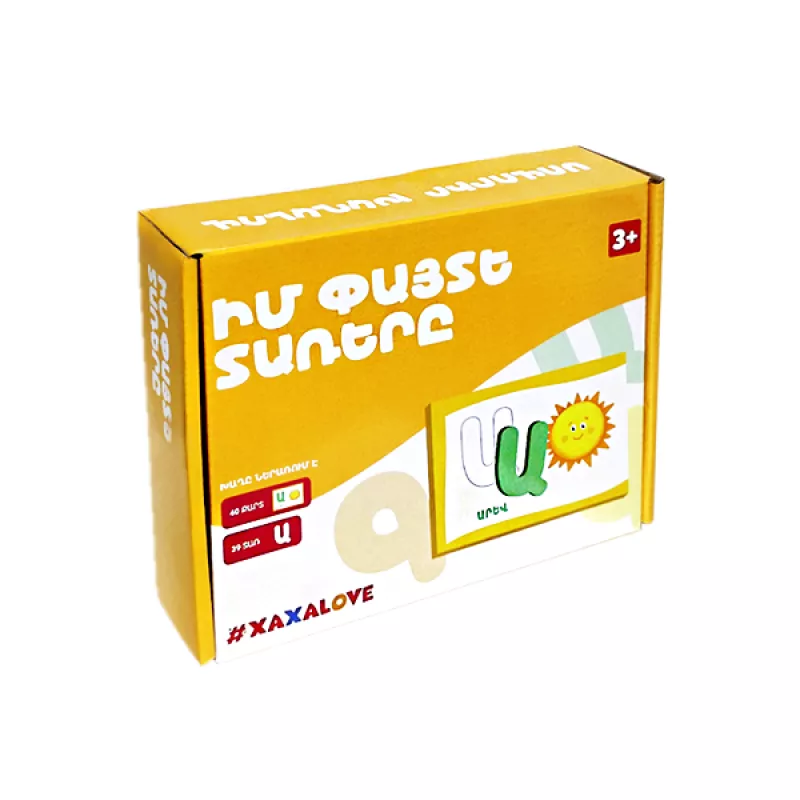 Զարգացնող, ուսուցանող խաղ՝ երեխաների համար։ Մարզում է ուշադրությունը, ընդլայնում երեխայի բառապաշարը, ծանոթացնում հայոց այբուբենին։ Ներառում է 40 քարտ 39 հայերեն փայտե տառ Մանրամասներ Տարիքը՝ 3+ Լեզուն՝ Հայերեն Տուփի չափսերը՝ 22x17x5 սմ Հեղինակ և Արտադրող Արտադրված է Հայաստանում Արտադրող՝ Xaxalove