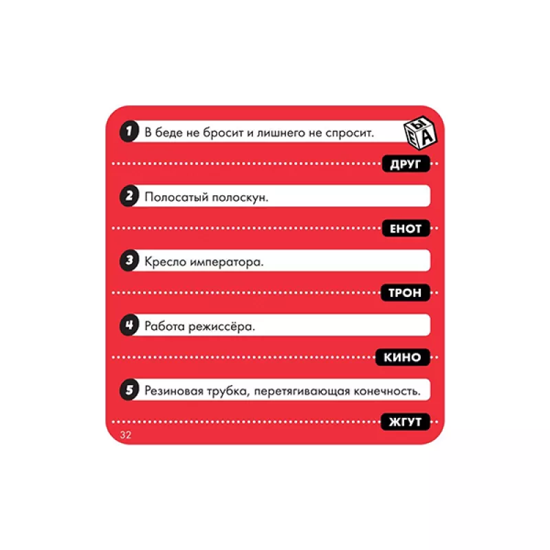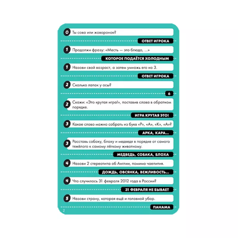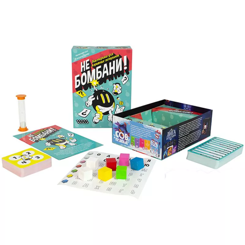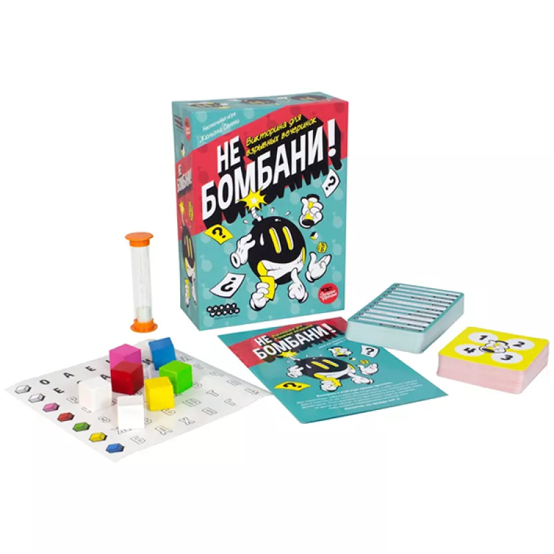 Ձեր առջև «Մի ռմբակոծիր» -սեղանի խաղն է ընկերական միջավայրում խաղալու համար: Այս խաղում հաղթելը հեշտ է: Երկու խաղացող կռմբակոծեն ձեզ հարցերով, և ձեզ մնում է միայն բռնել պահը և պատասխանել որքան հնարավոր է շատ հարցերին հատկացված ժամանակում: Որոշ հարցերի բարձրաձայն պատասխանելիս հավաքեք զառի վրա այլ հարցերի պատասխանները և միևնույն ժամանակ մի մոռացեք հետևել ժամանակին, որպեսզի ժամանակին շրջեք ավազի ժամացույցը:Ներառում է 50 Կապույտ քարտ (1000 հարց) 50 Կարմիր քարտ (500 հարց) 7 Զառ Կպչուն պիտակների թերթիկ տառերով Ավազի ժամացույց (30 վայրկյան) Ավազի ժամացույցի քարտ Խաղի կանոններ Մանրամասներ Տարիքը՝ 12 + Խաղացողների թիվը՝ 3-7 Խաղի տևողությունը՝ 25+ րոպե Տուփի չափսերը՝ 137x190x64 մմ Քարտի չափսը՝ 69x69 մմ Քարտի չափսը՝ 70x110 մմ Քաշը՝ 0,355 կգ Հեղինակներ և պրոդյուսեր Թողարկման տարեթիվ՝ 2021թ Արտադրող: Hobby World