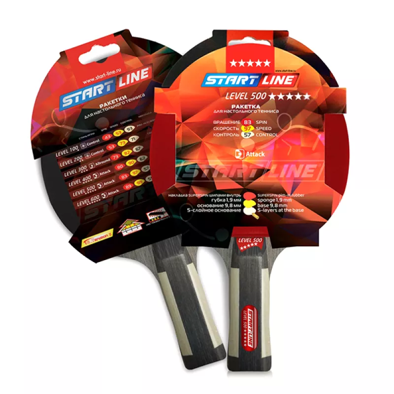 Start line Level 500 սեղանի թենիսի ռակետը համապատասխանում է որակի բարձր ժամանակակից ստանդարտին, ունի նորացված դիզայն, ինչպես նաև բարելավված տեխնոլոգիական և խաղային բնութագրեր: Ռակետը նախատեսված է այն մարզիկների համար, ովքեր նախընտրում են բազմակողմանի խաղաոճ: Այս մոդելը թույլ կտա համատեղել հարձակողական և պաշտպանական տարրերը։ Արտադրանքի առանձնահատկությունը անատոմիական բռնակով, որը երաշխավորում է ափի հարմարավետ տեղավորումը՝ նվազեցնելով ձեռքի ծանրաբեռնվածությունը:Մանրամասներ Ծածկույթ։ 1,9 մմ (SUPERSPIN pim-in) Հիմք՝ 5 շերտ (9,8 մմ) Արագություն՝ 97 Պտույտ՝ 83 Վերահսկողություն՝ 57