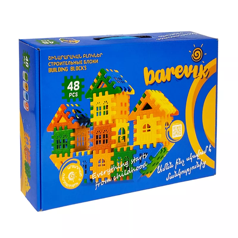 48 գույնզգույն մասերից բաղկացած այս շինարարական հավաքածուն հիանալի միջոց է երեխայի հետաքրքիր ժամանցը կազմակերպելու համար: Երեխան իրեն կզգա իրական շինարարի դերում: Այն մարզում է ուղեղը, զարգացնում երևակայությունը, տրամաբանությունը, ձեռք-աչք համակարգումը, մանր մոտորիկան և գունային ընկալումը: Նախատեսված է 3+ տարիքի երեխաների համար:
