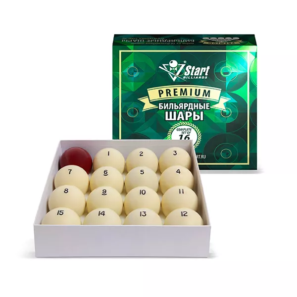 Start Billiards Պրեմիում հավաքածուն բաղկացած է 68 մմ տրամագծով 15 գնդակից և 1 հարվածող գնդակից: Գնդակները պատրաստված են պոլիեսթերից և նախատեսված են ռուսական պիրամիդա տեսակի բիլիարդ խաղալու համար։