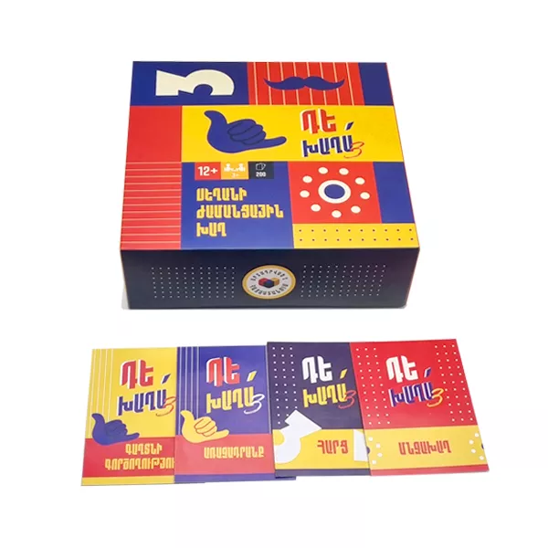 «Դե խաղա» խաղն իր մեջ ներառում է 200 խաղաքարտ։ Այն մշակվել է հումորի անսահման չափաբաժին ու հիշարժան պահեր պարգևելու համար։ Խաղի ներսում կան 4 տեսակի խաղաքարտեր, որոնցից յուրաքանչյուրը ենթադրում է որոշակի գործողություն կամ հարց։ Սա ծնողների մանկության անկեղծություն, թե համարձակություն խաղն է, լրամշակված, ավելի շատ հումոր, համարձակություն և իրար բացահայտելու հնարավորություններ ավելացրած։