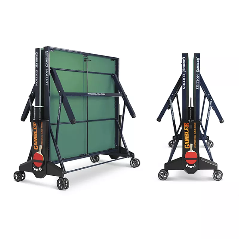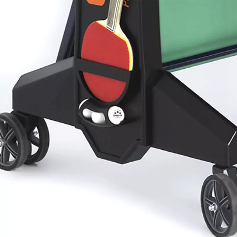 Սեղանի թենիսի այս մոդելը հարմար է մարզասրահում տեղադրելու համար: Կոնստրուկցիայի եզակի ծալովի համակարգն օժտված է այնպիսի տարրերով, որոնք ապահովում են սեղանի ամրությունը՝ ծալված և բացված վիճակում: Կողային հենակների բարձրությունը կարգավորելի է, ցանկացած հարթթության վրա հարմարավետությունն ապահովելու համար: Ռետինե անիվները երաշխավորում են սահուն մանևրում: